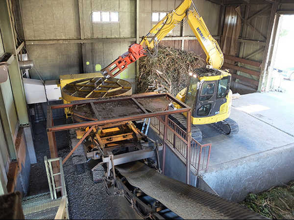 足柄上地区を中心に県西地域から発生する伐採や剪定した木材をこのリサイクルセンターで破砕し、チップ化した後、炭や堆肥などに再利用します。