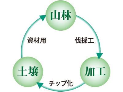 山の木を伐採してチップに加工し、それをまた自然に返して使う。この循環作業を行うことで、環境への負荷も少しは軽減できると思います。他社ではなかなかここまで事業化しているところはないので、おかげさまで忙しくしています。