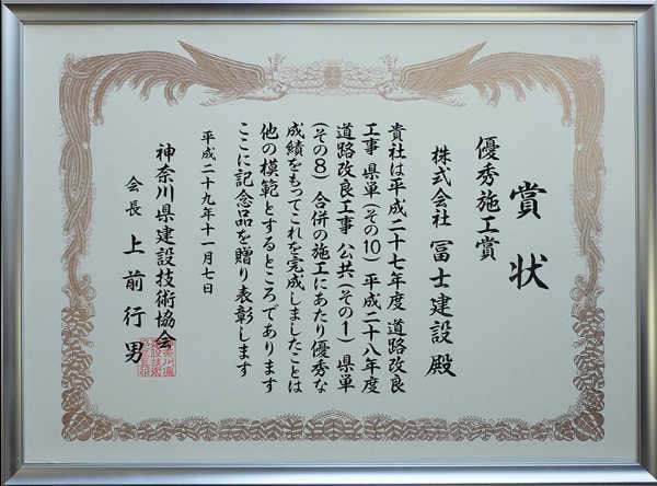 いただいた表彰の中より、平成29年神奈川県建設技術協会様からの『優良工事表彰』